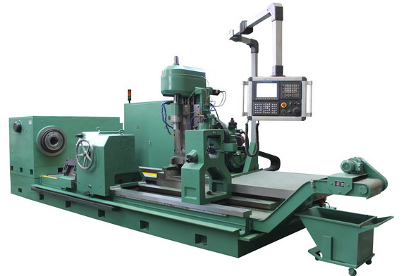 1.機床的主要用途和適用范圍及特點。 本機床系我公司開發(fā)的大規(guī)格花鍵軸銑床,本機床采用滾銑法可加工各種齒型的直斜齒花鍵軸零件,及直斜齒聯(lián)軸齒輪,并可以加工錐度花鍵及臺階齒輪。 本機床采用FANUC 0i-D交流伺服系統(tǒng),用交流伺服電機來控制銑頭的縱、橫向的定位、進給及加工時各順序動作的轉(zhuǎn)換,實現(xiàn)刀具的無極調(diào)速, 實現(xiàn)銑刀的自動調(diào)度,實現(xiàn)高速干切。具有可靠性高,保護功能完善等特點。 特別適用于成批和大量生產(chǎn)的工廠。 機床可選擇“順銑”或“逆銑”加工方式工作。 機床有自動竄刀機構(gòu),用于對刀和提高刀具壽命。 機床備有磁性排屑器。 機床備有中心架。 機床備有拖架,用于大型工件的支撐. 為提高機床的動靜剛度,床身采用加厚壁和閉肋筋的封閉結(jié)構(gòu),導(dǎo)軌為加寬的重型導(dǎo)軌。 尾座移動采用齒輪齒條的結(jié)構(gòu)。