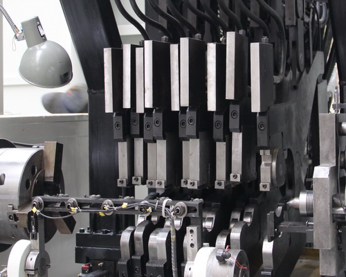 機(jī)床一次裝夾可實(shí)現(xiàn)曲軸所有主軸頸、連桿頸上的沉割槽圓角滾壓、在線測(cè)量、滾壓校直的自動(dòng)加工全過(guò)程,工作效率高,勞動(dòng)強(qiáng)度低,調(diào)整方便,機(jī)床采用懸掛式九鉗結(jié)構(gòu)系國(guó)內(nèi)外首創(chuàng),突破了導(dǎo)軌式曲軸圓角滾壓機(jī)床目前只設(shè)置5個(gè)滾壓鉗的局限。